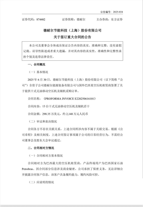 【壓縮機(jī)網(wǎng)】德耐爾7月15日發(fā)布公告稱,2025年6月30日,德耐爾節(jié)能科技股份有限公司全資子公司德耐爾能源裝備有限公司與國外巴西某空壓機(jī)租賃商簽署了關(guān)于提供干式無油移動空壓機(jī)及輔機(jī)采購訂單。合同內(nèi)容為13臺干式無油移動空壓機(jī)及輔機(jī)若干;合同金額為298.35萬美元(約2140萬元人民幣)。